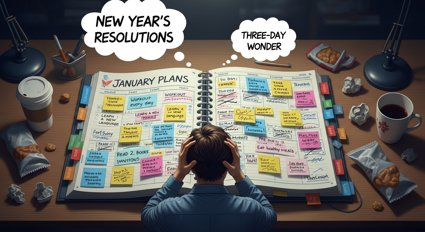 새해 첫날, 우리는 거창한 계획을 세웁니다. 하지만 1월 중순이 되면 대부분의 다짐은 흔들리기 시작합니다. 헬스장 출석률은 떨어지고, 사둔 책은 먼지만 쌓이며, 다이어트 식단은 어느새 치킨과 피자로 바뀝니다.